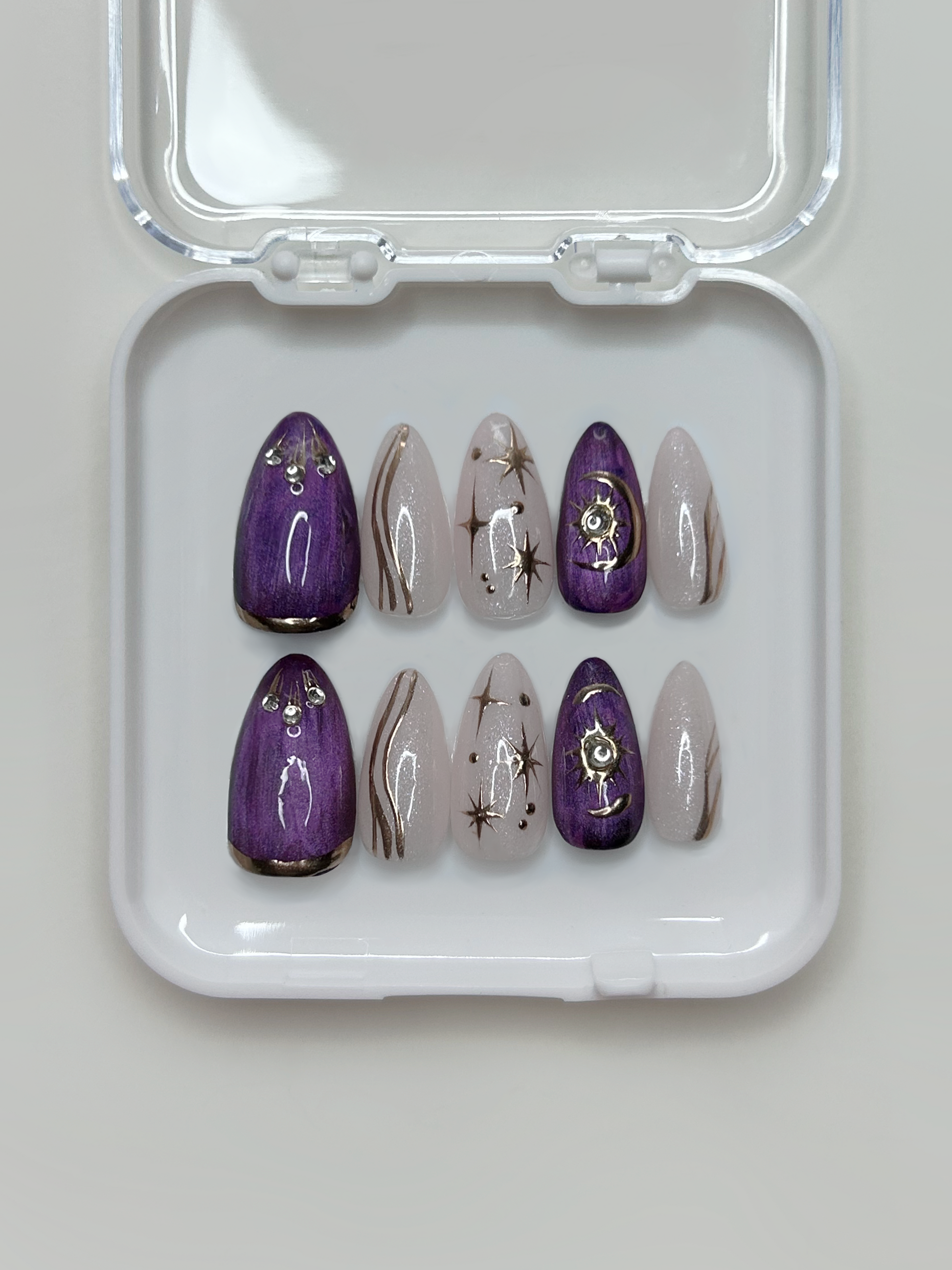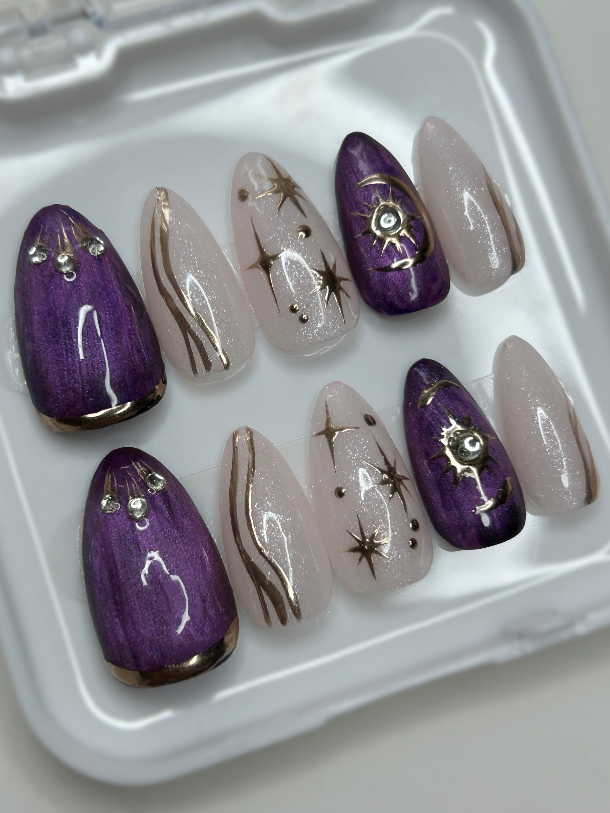 Unveil your inner moon goddess with Luna — an enchanting press-on nail set inspired by twilight skies, lunar magic, and celestial dreams. This set features a mystical blend of royal violet and soft milky nude tones, enhanced with golden starbursts, cosmic linework, and delicate rhinestone accents. Each nail is a miniature constellation, radiating quiet power and ethereal elegance.